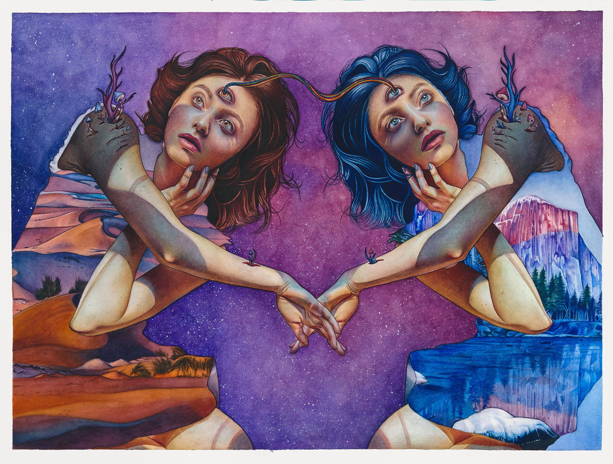 "Symbiosis" was created in 2021 on 18x24" paper using watercolor & white ink.