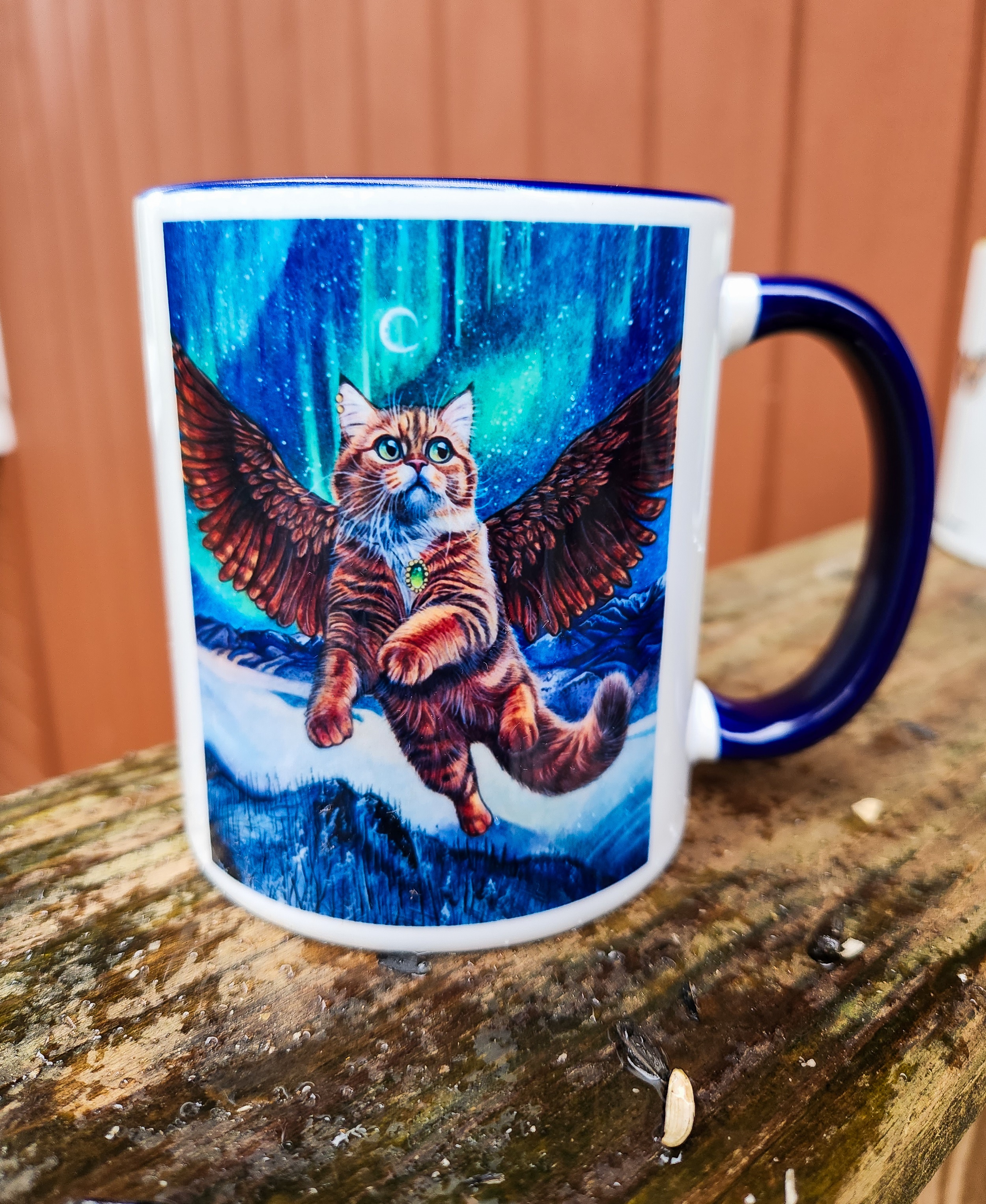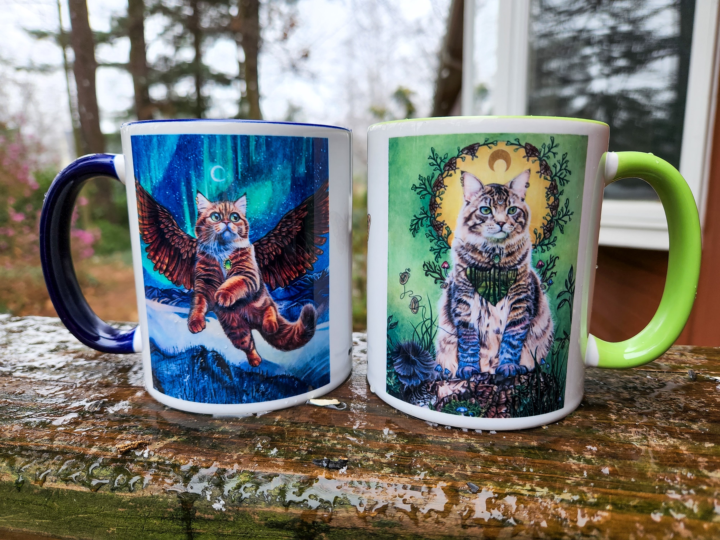 These mugs are printed with my flying kitty design mirrored on both sides. They are beautifully rendered and great for your morning tea, coffee, or a casual drink. They are microwave and dishwasher safe.