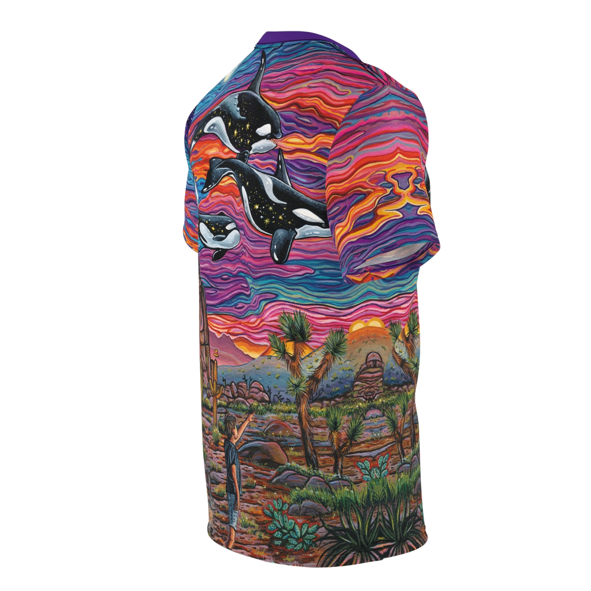 This vibrant all over printed t-shirt is decorated both front and back with my "Sky Pod" artwork. It's an instant standout in anyone's wardrobe. Made with 100% silky smooth, brushed polyester, these t-shirts are comfy, and designed to be shrink and fade-resistant.
